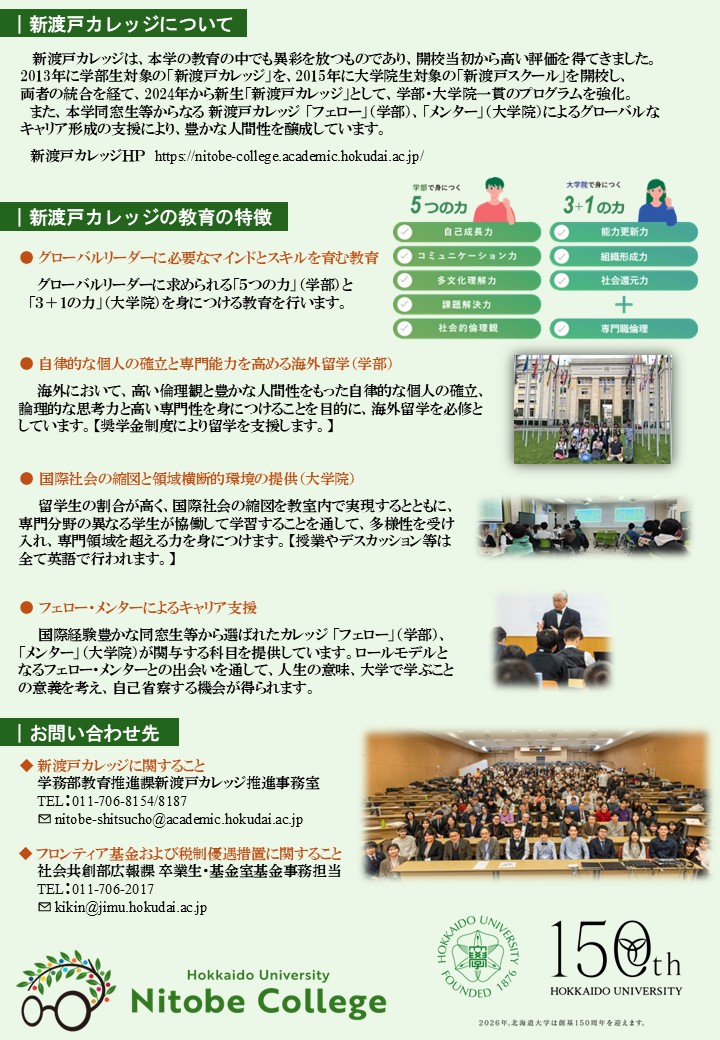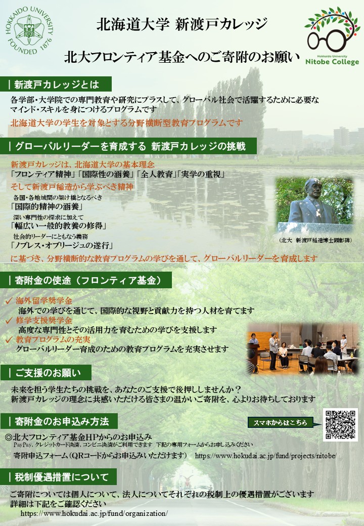 この奨学金は、新渡戸カレッジ修了生、北大の卒業生や新渡戸カレッジの理念に共感いただいた個人及び企業からの「北大フロンティア基金」への寄附により成り立っています。