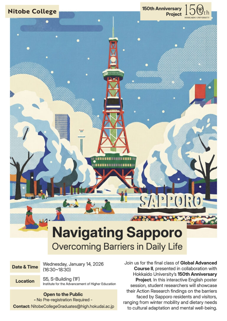 In this interactive English poster session, student researchers will showcase their findings on the barriers faced by Sapporo residents and visitors. The teams have investigated specific challenges related to “Navigating Sapporo,” ranging from physical mobility in winter to cultural adaptation and mental well-being.